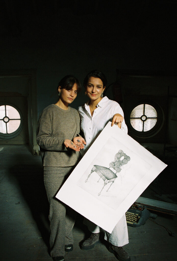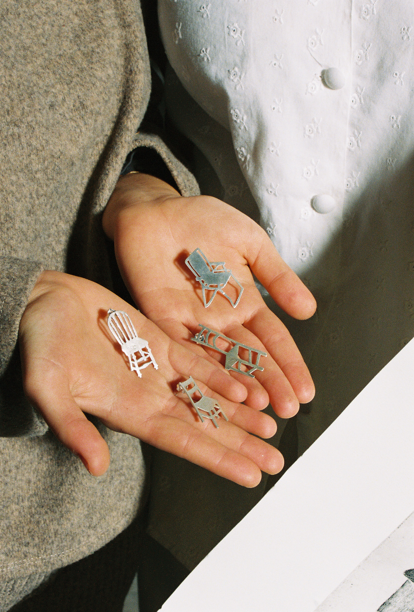 Eixo de Luz is an artistic collaboration between two artists: a painter and a jeweler. The creators met while studying Painting – Maria – and Sculpture – Inês – at the Faculty of Fine Arts. While chatting in the college corridors, they realized that if they joined forces they could create something new: chair-shaped earrings.